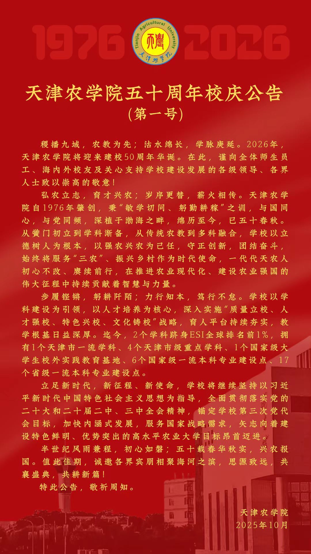 天津农学院五十周年校庆公告(第一号)